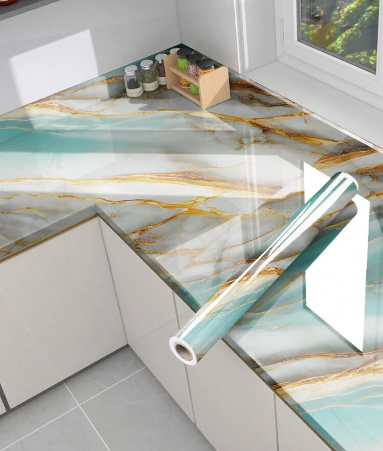Transform your kitchen or any surface with our captivating Aqua Marble Self-Adhesive Film. Inspired by luxurious natural stone, this elegant contact paper features a stunning blend of serene aqua blue, classic white, and intricate golden veining, creating a sophisticated and vibrant look. Perfect for revitalizing countertops, backsplashes, or furniture, it offers a high-end aesthetic with easy peel-and-stick application. Durable, waterproof, and simple to clean, it's the ideal solution for an instant home refresh.