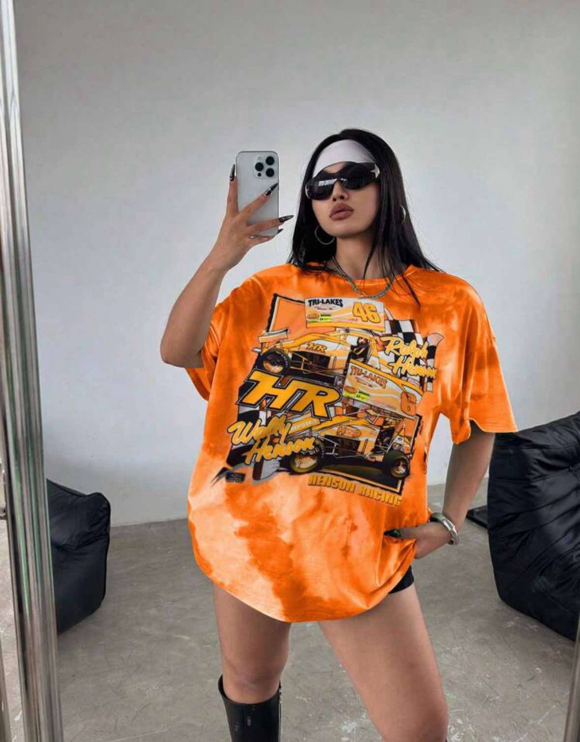 Inject some high-octane energy into your wardrobe with this orange tie-dye racing graphic t-shirt. The eye-catching design showcases vintage-style race cars and branding, set against a dynamic tie-dye background. Made for comfort and statement style, this tee is perfect for adding a unique twist to your casual wear.