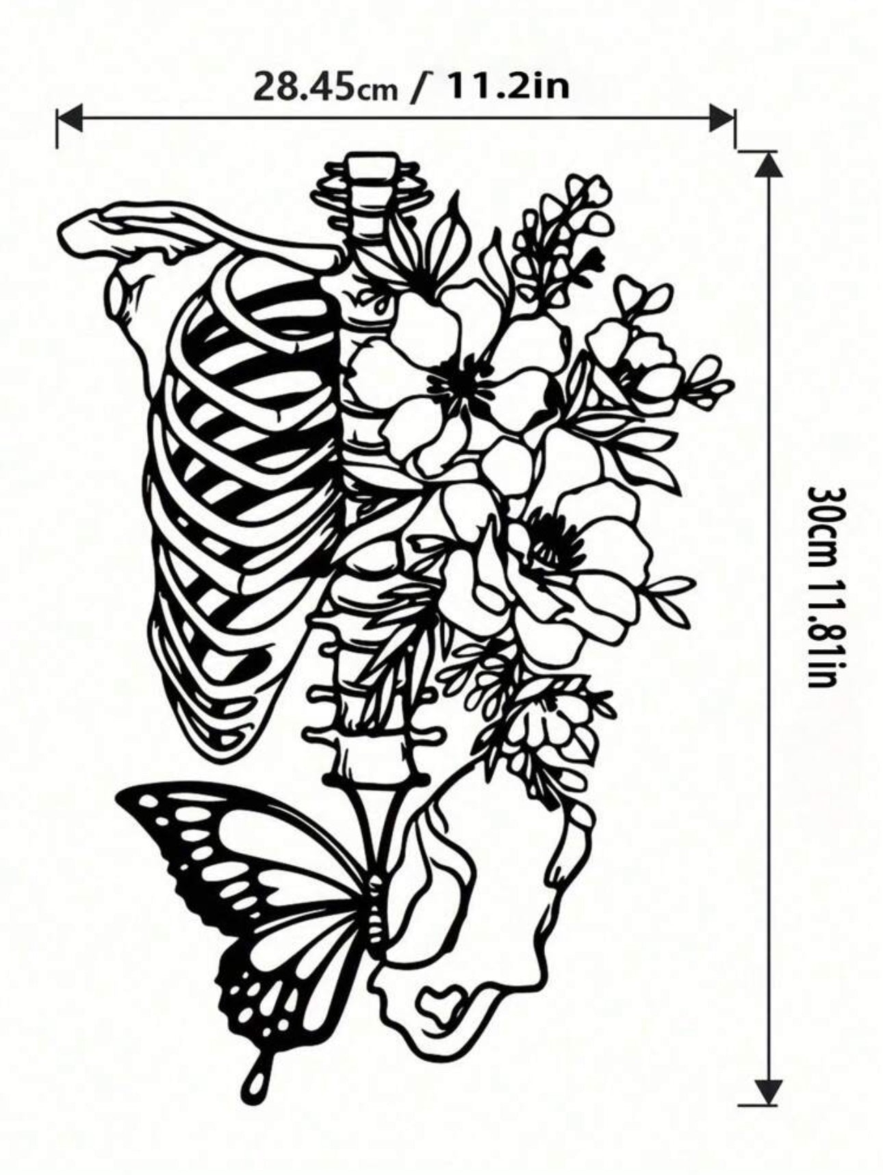 Add a touch of unconventional elegance to your décor with this intricately designed artwork. Featuring a stylized skeleton adorned with blossoms and a butterfly, this piece offers a unique blend of anatomical art and natural beauty. Its dimensions of 28.45cm by 30cm make it a perfect statement piece for walls or shelves.