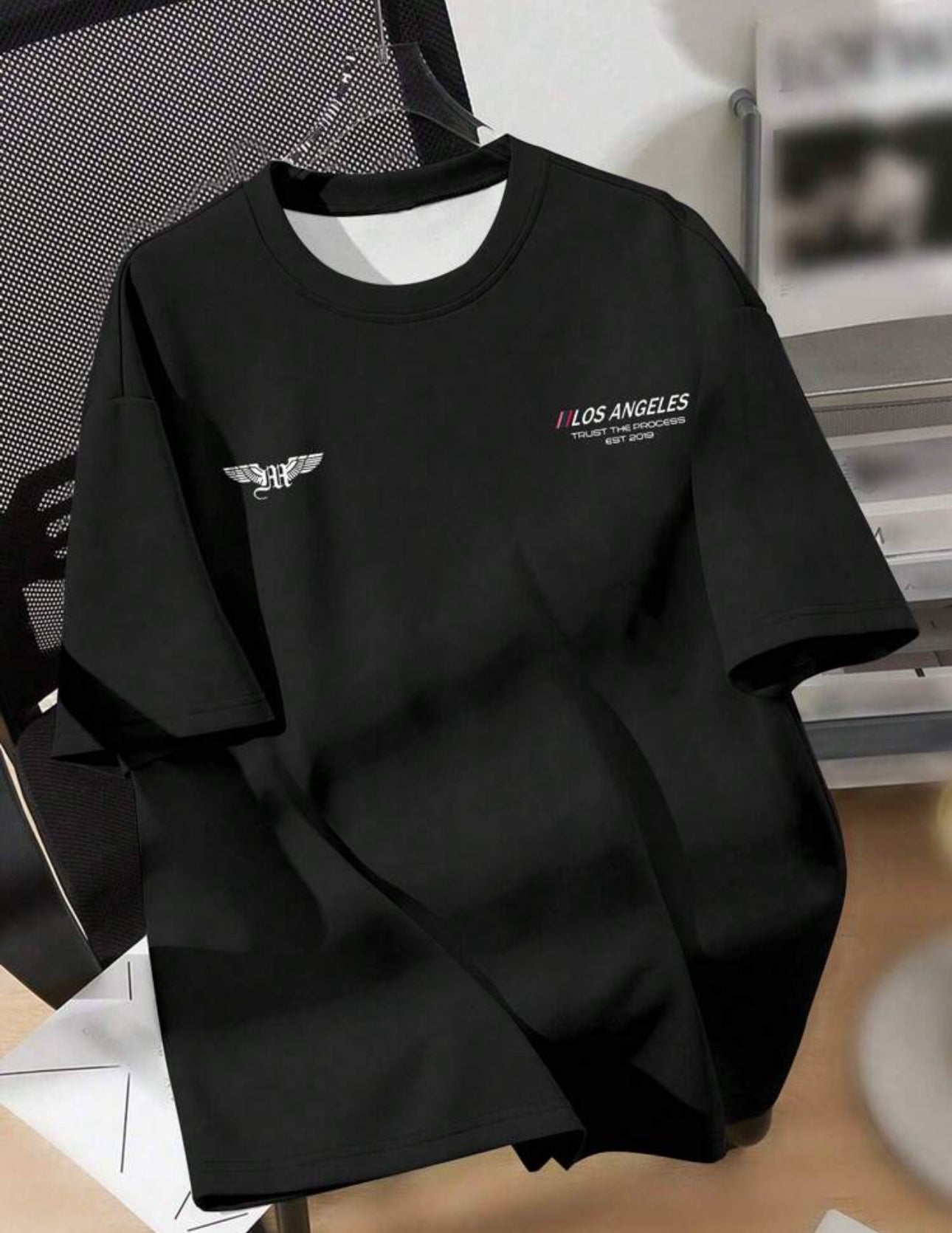 Embrace the urban vibe with this black t-shirt. The back features a striking graphic with "Los Angeles Dreaming" and white wings, complemented by the texts "Rebellious", "Trust", "Gang", "The Process", "Pure Fil", and "New York". This t-shirt is more than just clothing – it's a statement. Crafted for comfort and designed to inspire, it's perfect for those who live life on their own terms.