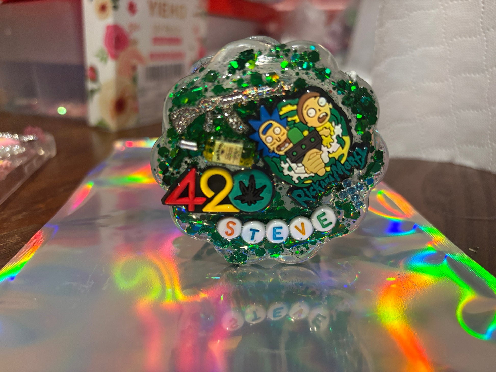 Show off your unique style with this custom-made, one-of-a-kind resin creation! This sparkling piece features a swirling galaxy of vibrant green glitter, encasing a fun assortment of embedded charms.