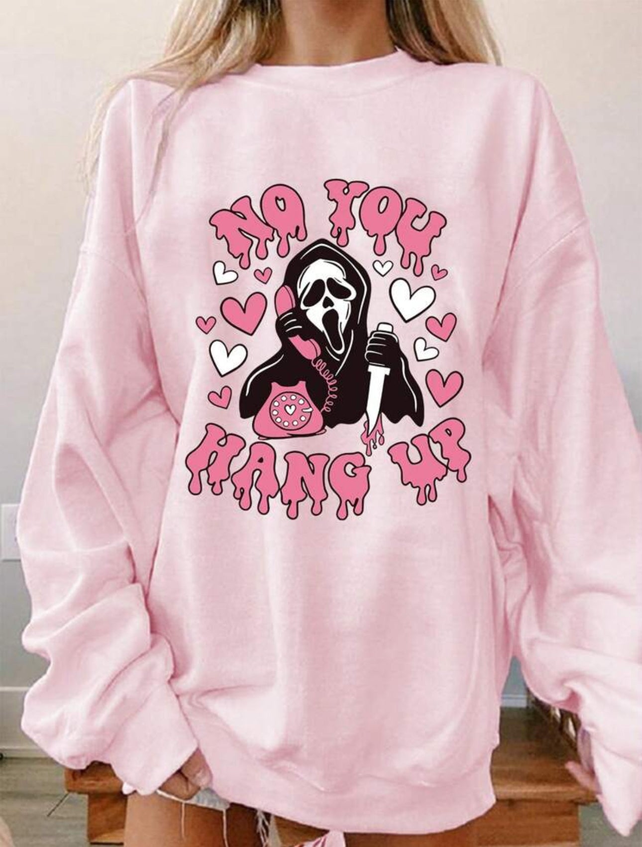 Get ready for a horror-filled romance with our exclusive Ghostface sweatshirt. This playful graphic takes the classic slasher villain and gives him a sweet upgrade with a pink color scheme and surrounding hearts. The bold "NO YOU HANG UP" text and comfy crewneck make this the perfect piece for movie nights or just showing off your unique style.