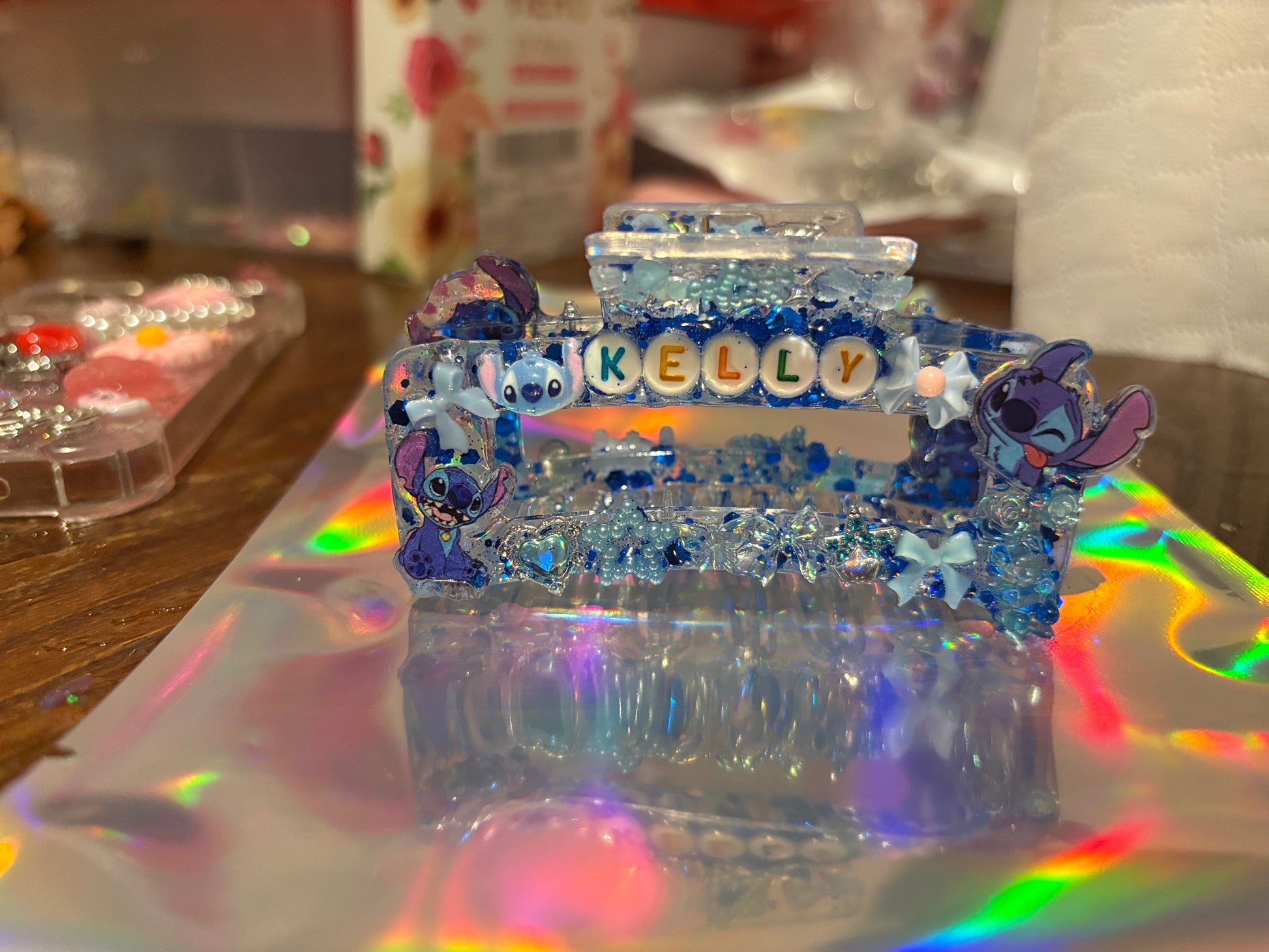 This custom-made hair clip is a sparkling tribute to the beloved character Stitch! Made with shimmering blue and clear resin, it features a variety of embellishments, including glitter, star-shaped confetti, and tiny beads that catch the light beautifully.